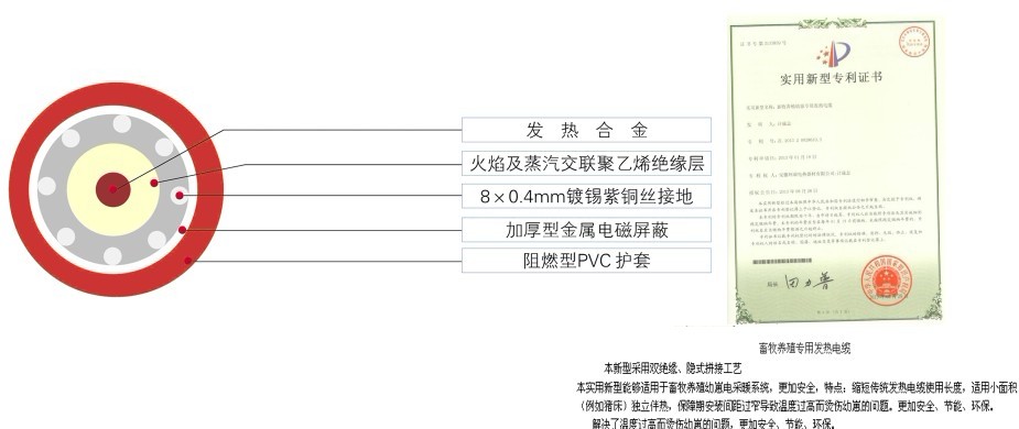 我司提供的一種畜牧養(yǎng)殖幼崽專用發(fā)熱電纜,包括有發(fā)熱合金,所述的發(fā)熱合金外依次包覆有塑料導體、氟隆絕緣層、火焰及蒸汽交聯(lián)聚乙烯絕緣層、鍍錫紫銅絲接地、加厚型金屬電磁屏蔽層、阻燃型PVC外護套和彈性橡膠軟套,所述的發(fā)熱合金和塑料導體融為一體,防止電打火的情況發(fā)生。