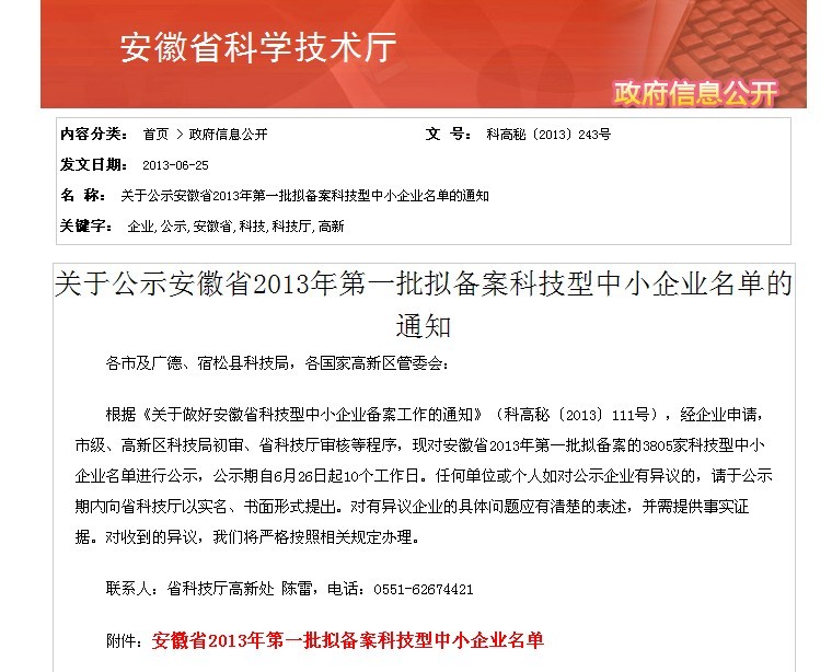 根據《關于做好安徽省科技型中小企業備案工作的通知》(科高秘〔2013〕111號),經企業申請,市級、高新區科技局初審、省科技廳審核等程序,安徽環瑞入選2013年第一批備案科技型中小企業。