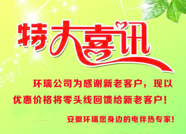 為感謝新老客戶對環(huán)瑞公司發(fā)展給予的支持,現(xiàn)有零頭線將以優(yōu)惠價回饋給新老客戶,歡迎廣大新老客戶咨詢訂購,環(huán)瑞十年專注電伴熱產(chǎn)品研發(fā),品質(zhì)保證。