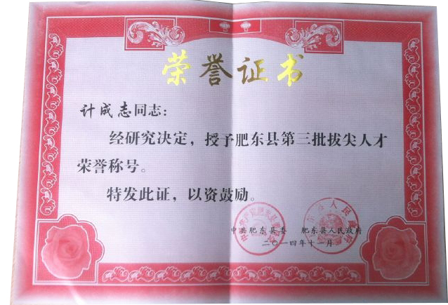 肥東縣委、縣政府為表彰環(huán)瑞公司對肥東縣當(dāng)?shù)亟?jīng)濟發(fā)展所作的貢獻,特授予環(huán)瑞董事長計成志“肥東縣第三批拔尖人才”榮譽稱號。