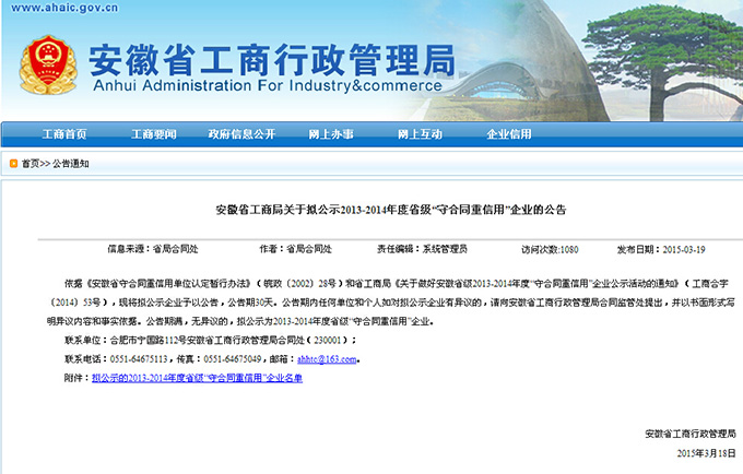 熱烈慶祝安徽環(huán)瑞榮獲2013-2014年度省級“守合同重信用”企業(yè)